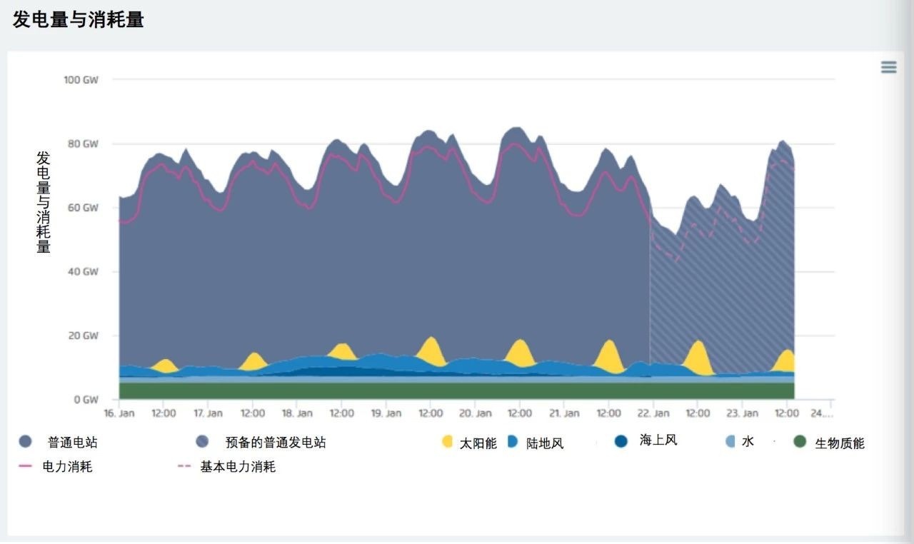 2017年初,這種天氣狀況十分常見,如下圖所示,1月中旬的風能和太陽能發(fā)電量非常低: