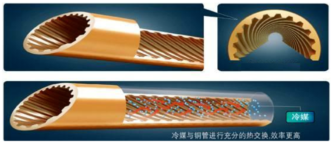需要進(jìn)一步強(qiáng)化耐高寒空氣源熱泵的內(nèi)部換熱,縮小應(yīng)傳熱推動(dòng)力不足而擴(kuò)大的冷凝溫度與蒸發(fā)溫度的差值,提高主機(jī)的?效率。由于更低環(huán)溫對(duì)應(yīng)更低的冷媒蒸汽壓,相應(yīng)造成氣相部分在蒸發(fā)器管道內(nèi)的流速增加,但同時(shí)又受到摩擦阻力和聲速限制,更會(huì)造成蒸發(fā)器管道內(nèi)壁的換熱效能未被充分發(fā)揮。因此,需要為蒸發(fā)器選擇新型的管材,比傳統(tǒng)帶梯形槽的強(qiáng)化換熱管或者更早期采用的光管,更有利于在高寒地區(qū)工作。