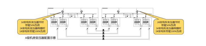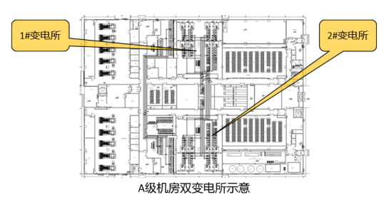 C級、B級機房無變配電所物理隔離要求;若C級、B級機房改A級機房,則每個變電所之間需做物理隔離。若配電系統(tǒng)采用2N構(gòu)架,則至少需要設(shè)置兩個物理隔離的變電所,每個變電所平時各帶50%負荷,當一個變電所完全斷電時,另一個變電所帶載100%負荷。若配電系統(tǒng)采用2+1的DR構(gòu)架,則至少需要設(shè)置三個物理隔離的變電所,每個變電所平時各帶66%負荷,當其中一個變電所完全斷電時,另兩個變電所帶載100%負荷。