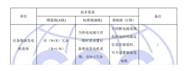 國標GB50174-2017《數(shù)據(jù)中心設(shè)計規(guī)范》中對于A、B、C三級數(shù)據(jù)中心后備柴油發(fā)電機系統(tǒng)的具體要求如下: