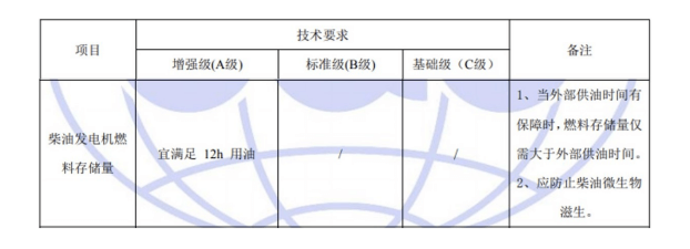 國標GB50174-2017《數(shù)據(jù)中心設(shè)計規(guī)范》中對于A、B、C三級數(shù)據(jù)中心后備柴油發(fā)電機燃料存儲系統(tǒng)的具體要求如下: