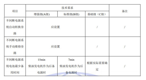 國標GB50174-2017《數(shù)據(jù)中心設(shè)計規(guī)范》中對于A、B、C三級數(shù)據(jù)中心不間斷電源系統(tǒng)旁路及備用時間的具體要求如下: