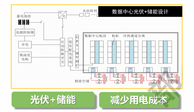 項目可根據(jù)當?shù)厍闆r增加光伏儲能一體化設(shè)備,光伏、谷電、平電為儲能系統(tǒng)充電,峰電時段儲能系統(tǒng)放電,減少機房用電成本。