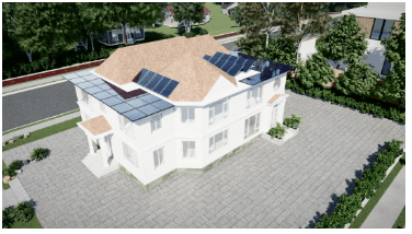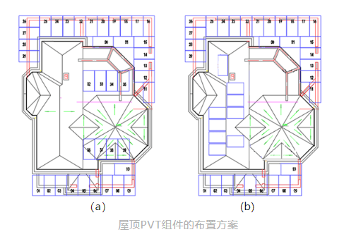 原有屋面系統(tǒng)上2處坡度安裝的PVT組件,則過于突兀,對(duì)建筑外觀破壞過大;且位于小平臺(tái)上的4塊PVT組件采光條件復(fù)雜,在系統(tǒng)中又與南向坡面的4塊PVT組件同處一個(gè)組串,相互干擾,影響系統(tǒng)效率。因此,重新考慮將其布置于東向和西向坡屋面上,如下圖b,雖然也對(duì)建筑觀瞻有一定負(fù)面影響,但隨著近些年公眾對(duì)屋面光伏系統(tǒng)的接受度越來越高,屋面上整齊敷貼布設(shè)的光伏板已經(jīng)成為業(yè)主前衛(wèi)新潮、崇尚環(huán)保的新標(biāo)簽。屋頂小平臺(tái)建議恢復(fù)為屋頂花園景觀,提升整個(gè)建筑的靈動(dòng)感。