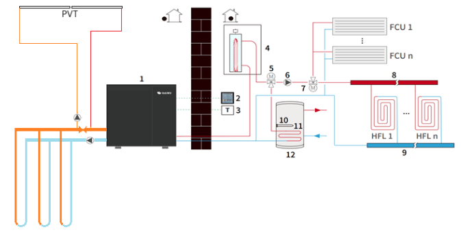 方案一:安裝一臺(tái)滿足冷負(fù)荷64.22kW的空氣源熱泵。此方案為典型的冷暖熱水3聯(lián)供系統(tǒng),常見系統(tǒng)如下圖??諝庠礋岜孟募居糜诳照{(diào)制冷、冬季用于供暖、熱水在供暖季采用熱泵切換加熱、在非采暖季采用電加熱管加熱。如果設(shè)想夏季利用PVT的熱量加熱水箱,鑒于熱水的需熱量過小,系統(tǒng)的復(fù)雜程度不宜過高,不予采納。又由于空氣源熱泵與pvt熱量耦合利用的季節(jié)性矛盾,本項(xiàng)目不適用此方案。