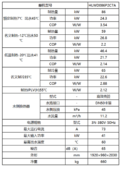 空氣源熱泵主機(jī),選用海悟HLWD086P2C7A空氣源熱泵機(jī)組1臺(tái),該機(jī)組低溫工況制熱量(-12℃)為59kW、COP為2.2,極端氣候或地源熱泵系統(tǒng)故障時(shí),可作為供暖熱源備份;額定制冷量65kW,滿足本項(xiàng)目夏季制冷的需求。