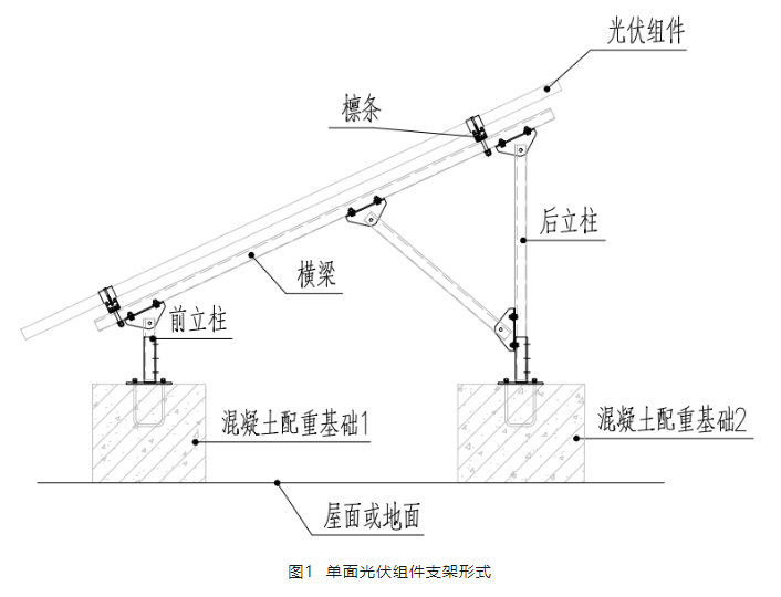 該支架體系由前后兩根立柱支撐一根橫梁,沿橫梁縱向搭設(shè)檁條,檁條之上通過壓塊將組件固定。該體系通過前后立柱的混凝土配重墩固定在屋面或者地面上。結(jié)構(gòu)橫向由斜撐形成固定體系,縱向由混凝土基礎(chǔ)和檁條形成固定體系。經(jīng)眾多實際項目驗證,該結(jié)構(gòu)體系能滿足光伏使用的結(jié)構(gòu)安全需要。