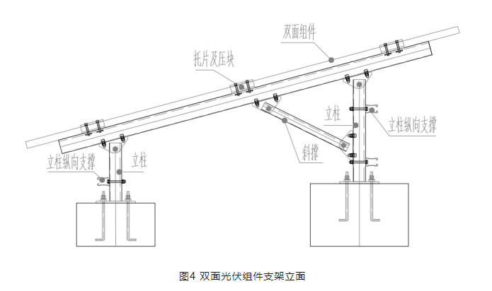 每塊光伏組件兩側(cè)均設(shè)置橫梁,組件通過壓塊和托片固定到橫梁上,橫梁通過前后立柱固定到基礎(chǔ)上。為了保證結(jié)構(gòu)側(cè)向的穩(wěn)定,前立柱沿縱向設(shè)置一根縱向支撐,后立柱沿縱向設(shè)置兩根縱向支撐,雙面光伏組件支架立面如圖4所示。該支架結(jié)構(gòu)體系取消縱向檁條,有效的避免了其對組件背面的遮擋。同時立柱設(shè)置的縱向支撐,提供了支架縱向的剛度,使支架在縱向形成穩(wěn)定的支架體系。具體安裝效果詳見第7節(jié)應(yīng)用案例。
