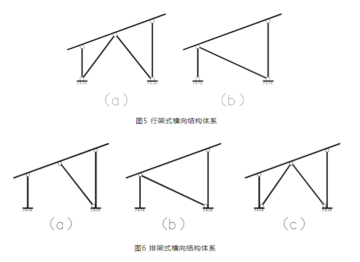 圖4所示支架橫向結(jié)構(gòu)可根據(jù)立柱與基礎(chǔ)連接形式的不同,分為兩種結(jié)構(gòu)體系,柱底鉸接和柱底固結(jié)的形式。柱底鉸接形式為行架式橫向結(jié)構(gòu)體系,柱底固結(jié)為排架式橫向結(jié)構(gòu)體系。圖5所示兩種形式均為行架式橫向結(jié)構(gòu)體系,該結(jié)構(gòu)體系前后立柱與基礎(chǔ)采用鉸接的形式,并且采用一根或者兩根橫向支撐提供側(cè)向剛度,形成穩(wěn)定的結(jié)構(gòu)不變體系。圖6所示三種形式均為排架式橫向結(jié)構(gòu)體系,該結(jié)構(gòu)體系前后立柱與基礎(chǔ)采用固結(jié)的形式,并且采用一根或兩根縱向支撐提供側(cè)向剛度,增強結(jié)構(gòu)的抗側(cè)力穩(wěn)定性?;A(chǔ)設(shè)計同傳統(tǒng)光伏支架。