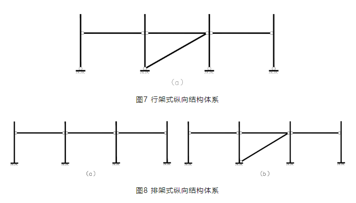 支架縱向結(jié)構(gòu)體系根據(jù)立柱與基礎(chǔ)的連接形式不同,同樣分為兩種結(jié)構(gòu)體系,柱底鉸接和柱底固結(jié)的形式。柱底鉸接形式為行架式縱向結(jié)構(gòu)體系,見圖7。柱底固結(jié)為排架式縱向結(jié)構(gòu)體系,見圖8。