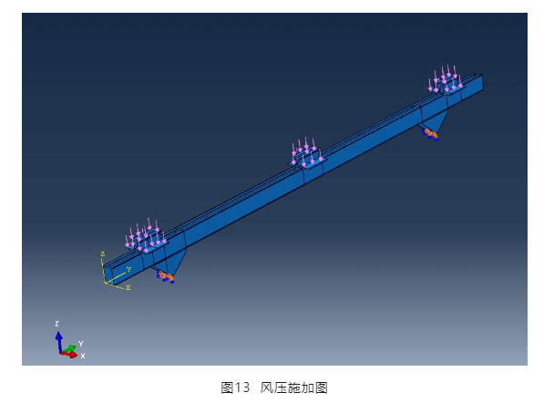 為驗證壓塊與橫梁節(jié)點部位的受力,取一根橫梁采用三維應(yīng)力單元進行仿真分析。風(fēng)荷載施加到壓塊上,通過壓塊傳遞給橫梁,三角連接件底部設(shè)置固定支座,見圖13,橫梁通過三角支座固定。