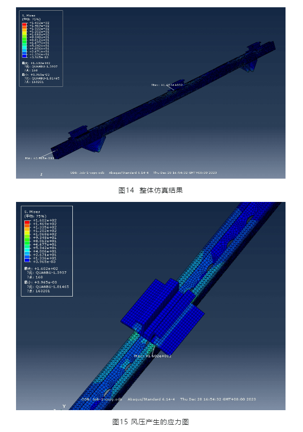 設(shè)計規(guī)范要求,支架采用的螺栓均固定擰緊。因此,各部分可視為緊密結(jié)合,不產(chǎn)生滑移,采用共單元節(jié)點進行仿真分析。通過圖14及圖15可以看出,風(fēng)壓產(chǎn)生的最大應(yīng)力在橫梁上,為160.2MPA,小于鋼材強度設(shè)計值215MPA。