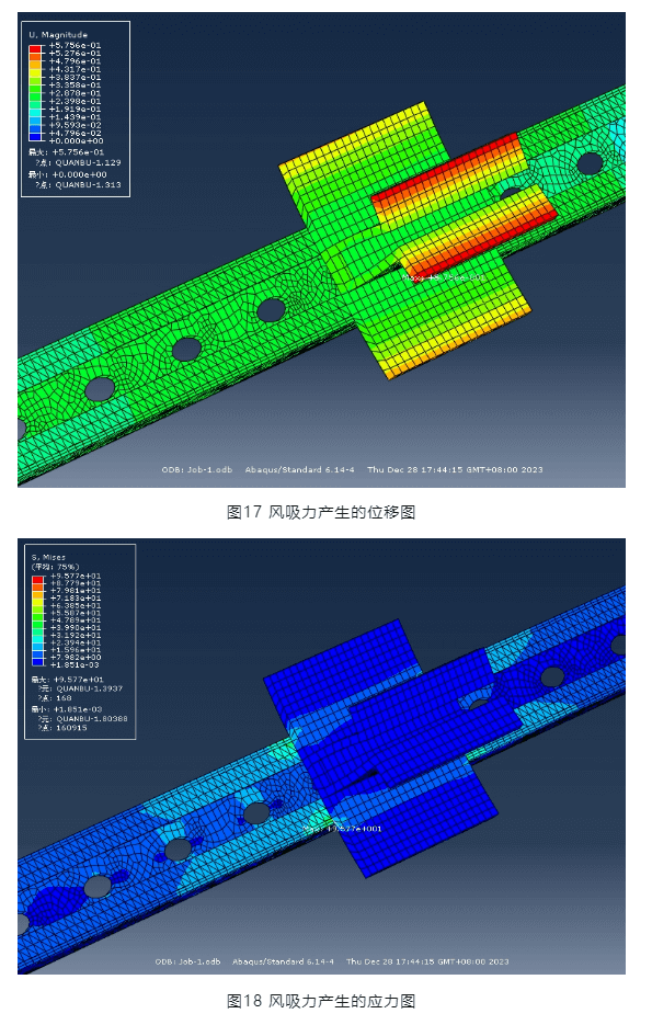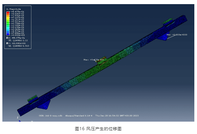 從圖16可以看出,風(fēng)壓產(chǎn)生的最大位移為0.95mm(特別指出該位移與圖11、12所示位移不同,是因為荷載施加方式不同,圖11及圖12僅為驗證結(jié)構(gòu)體系整體穩(wěn)定性,因此荷載采取沿橫梁施加線荷載的方式),橫梁截面無翹曲,因此,該創(chuàng)新壓塊節(jié)點滿足強度要求。