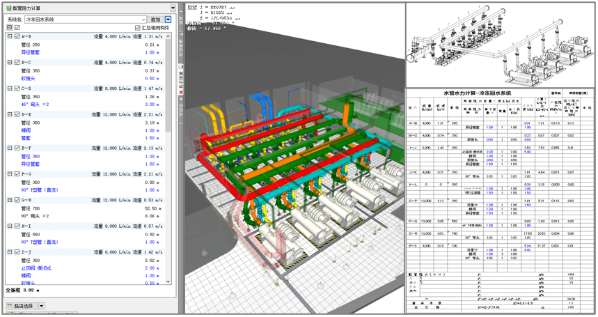 BIM模型進行管道綜合調(diào)整優(yōu)化后,考慮對所選設(shè)備進行調(diào)優(yōu)選型,重點在于水泵及風(fēng)機的阻力校核,指導(dǎo)設(shè)備選型、路由優(yōu)化、閥件優(yōu)選和連接優(yōu)化。通過對水系統(tǒng)管道的阻力校核,對水泵的優(yōu)選做出推薦,同時對管路組件進行優(yōu)化。
