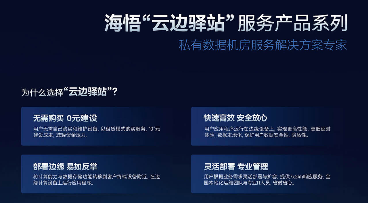 綜上所述,海悟云“云邊驛站”私有數(shù)據(jù)中心托管服務(wù)解決方案,以其卓越的安全性、高效的本地化算力、全方位的服務(wù)保障以及靈活的配置選項(xiàng),正逐步成為企業(yè)數(shù)字化轉(zhuǎn)型道路上的堅(jiān)實(shí)后盾。選擇“云邊驛站”,即是選擇了一個(gè)值得信賴(lài)的合作伙伴,共同開(kāi)啟企業(yè)數(shù)據(jù)管理與應(yīng)用的新篇章。