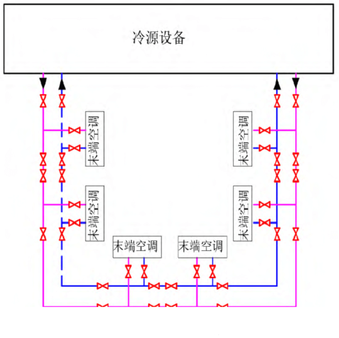 兩種方案相似但有不同,最明顯的差異是冷卻液管路的不同。為了實(shí)現(xiàn)冷卻液循環(huán)的連續(xù)性,避免單點(diǎn)故障,根據(jù)各自建筑條件,項(xiàng)目A冷卻液管路采用雙供雙回的方式,項(xiàng)目B采用環(huán)形管路的方式,均可實(shí)現(xiàn)系統(tǒng)的冗余,見圖 5 和圖 6。通過對比分析,兩種方式實(shí)現(xiàn)的功能和可靠性是一致的,系統(tǒng)管路各有特點(diǎn),實(shí)際應(yīng)用過程中可以結(jié)合不同建筑布局、尺寸面積、出柜率,以及運(yùn)維通道等進(jìn)行選擇。