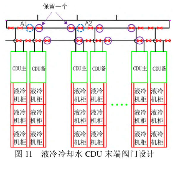 系統(tǒng)改造過程中,需要特別關(guān)注如下幾方面。一是原有冷卻水系統(tǒng)水質(zhì)運(yùn)行情況,如果水質(zhì)運(yùn)行不良,為避免切換到冷凍水作為冷源運(yùn)行時(shí)污染冷凍水系統(tǒng),可以在冷凍水回水管路上增加過濾器進(jìn)行處理后再回到總的冷凍水大管網(wǎng)系統(tǒng)中。二是切換過程中,需要分別核算下液冷CDU分別在冷卻水系統(tǒng)和冷凍水系統(tǒng)運(yùn)行時(shí)管網(wǎng)的壓力大小,兩者接近最優(yōu),如果冷凍水運(yùn)行的壓力高于冷卻水運(yùn)行的壓力,切換過程中重點(diǎn)關(guān)注閥門切換的時(shí)間,同時(shí)要監(jiān)測好冷凍水系統(tǒng)自身的補(bǔ)水處于正常運(yùn)行工況,避免冷凍水壓力快速下降,影響到自身的運(yùn)行。三是冷卻水管路上的閥門設(shè)置,要避免過設(shè)計(jì)超配閥門,避免不加分析的直接使用傳統(tǒng)冷凍水系統(tǒng)管路的閥門設(shè)計(jì)方式。按照GB50174-2017《數(shù)據(jù)中心設(shè)計(jì)規(guī)范》,末端設(shè)備如冷凍水精密空調(diào)通常按照N+1設(shè)計(jì),也即是有1臺(tái)備用;為實(shí)現(xiàn)運(yùn)行過程中閥門單點(diǎn)故障時(shí)檢修更換,通常末端設(shè)備,會(huì)連續(xù)設(shè)計(jì)2個(gè)閥門,見圖 10[12],當(dāng)其中一個(gè)閥門故障時(shí),可以關(guān)閉該故障閥門左右相鄰的閥門,只需要停機(jī)1臺(tái)設(shè)備,而不影響主用設(shè)備數(shù)量的正常使用。但是對于液冷系統(tǒng),通常CDU是1用1備,相鄰的一組也是1用1備,兩組CDU之間的閥門,完全可以有原來的2個(gè)閥門只保留1個(gè)閥門;當(dāng)其中一個(gè)閥門故障時(shí),可以通過關(guān)閉A1和A2閥門來實(shí)現(xiàn)隔斷功能,見圖 11。雖然需要停機(jī)2臺(tái)CDU,但2組設(shè)備各有1臺(tái)備用不會(huì)影響到設(shè)備的正常使用。