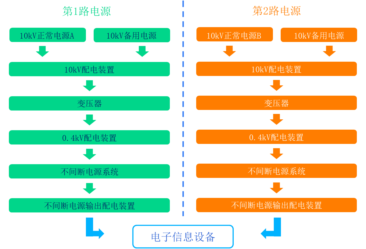 為提高電源的可靠性,電子信息設(shè)備由雙路電源供電。大中型數(shù)據(jù)中心供配電系統(tǒng)就是從10kV 電源進(jìn)線,經(jīng)過(guò)10kV配電裝置、變壓器、0.4kV配電裝置、不間斷電源系統(tǒng)及不間斷電源輸出配電裝置,到電子信息設(shè)備電源進(jìn)線這個(gè)過(guò)程。在這個(gè)過(guò)程中有兩種應(yīng)用方式影響了數(shù)據(jù)中心供配電系統(tǒng):
