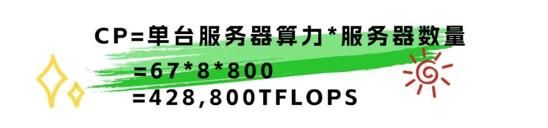 通過上表查出,H100 GPU單卡算力為67TFLOPS, 單臺服務(wù)器共有8張GPU卡。在忽略CPU算力的情況下,可計算出數(shù)據(jù)中心中心的算力規(guī)模為: