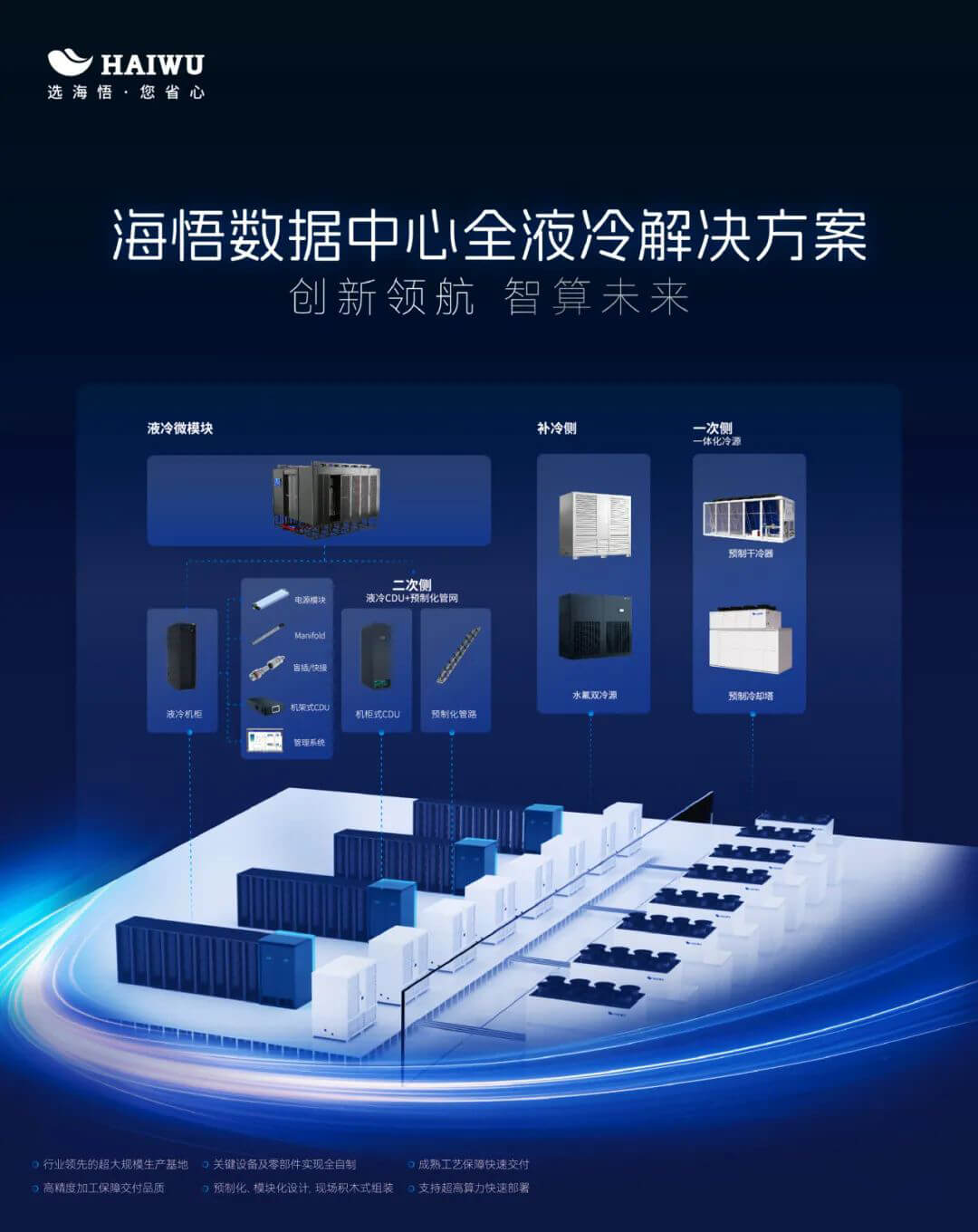 面對(duì)算力變革及機(jī)房實(shí)際運(yùn)營(yíng)需求,海悟針對(duì)超算、智算等高密場(chǎng)景,通過(guò)模塊化、預(yù)制化等關(guān)鍵技術(shù)打造極簡(jiǎn)交付、極致節(jié)能、極致節(jié)水、穩(wěn)定可靠、智能運(yùn)維的高密近場(chǎng)風(fēng)墻、冷板式液冷、浸沒式液冷等全場(chǎng)景解決方案產(chǎn)品。