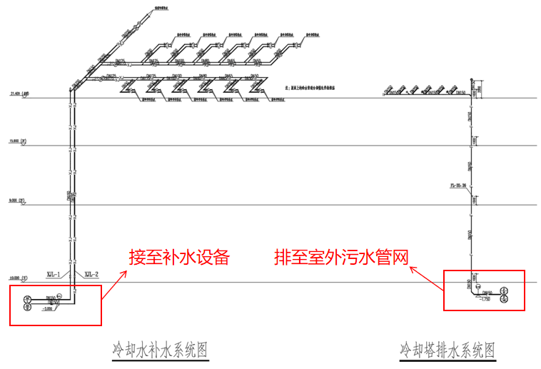 1、為考慮補(bǔ)水的安全性,補(bǔ)水管成環(huán)狀布置,接入冷塔的補(bǔ)水管加裝閥門。