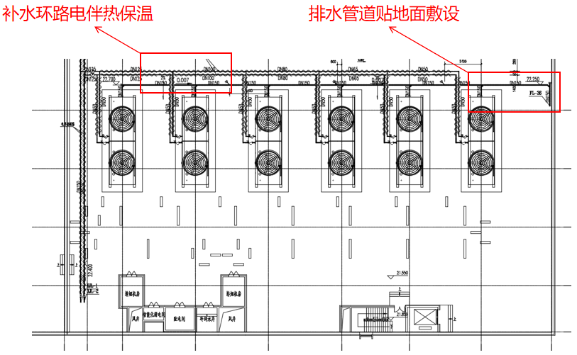 2)在嚴(yán)寒地區(qū),冷卻塔排水應(yīng)通過室內(nèi)排水管道直接排至室外下水道,出屋面排水管也應(yīng)設(shè)電伴熱保溫。