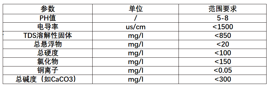 2、機房改造時,需根據(jù)水源水質(zhì)條件,選擇合理的水處理工藝。間接蒸發(fā)冷卻空調(diào)設(shè)備補水水質(zhì)應滿足《采暖空調(diào)系統(tǒng)水質(zhì)》GB/T 29044-2012第4.4條規(guī)定。具體到廠家產(chǎn)品可有不同的水質(zhì)要求,但應高于規(guī)范要求。以海悟產(chǎn)品為例,海悟AHU間接蒸發(fā)冷卻節(jié)能機組補水需滿足的水質(zhì)指標如下:
