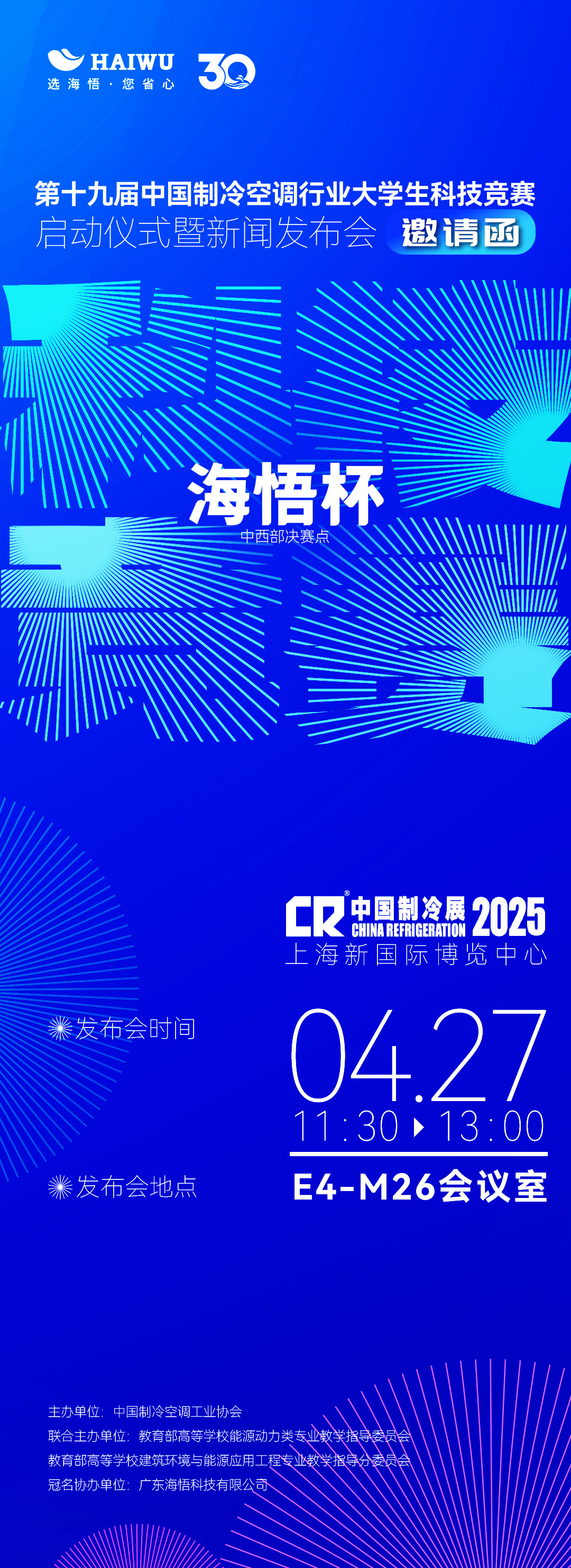 2025 年 4 月 27 日,在第三十六屆國(guó)際制冷、空調(diào)、供暖、通風(fēng)及食品冷凍加工展覽會(huì)(“2025 中國(guó)制冷展”)期間,于上海新國(guó)際博覽中心,一場(chǎng)意義非凡的啟動(dòng)儀式暨新聞發(fā)布會(huì)盛大舉行 —— 由廣東海悟科技有限公司贊助協(xié)辦、中國(guó)制冷空調(diào)工業(yè)協(xié)會(huì)聯(lián)合舉辦的 2025 第十九屆中國(guó)制冷空調(diào)行業(yè)大學(xué)生科技競(jìng)賽正式拉開帷幕。