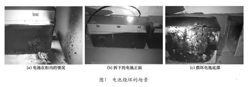 ?、賆X企業(yè)的二臺30kVAUPS,電池是12V/65Ah,其中一臺發(fā)生電池起火冒煙。煙霧非常大,整個配電室全是煙霧,電氣工作人員帶防毒用具進入配電室進行操作,因未見明火,消防隊到現(xiàn)場沒有處置,由電氣工作人員進行操作,用風機排煙?,F(xiàn)場情況是UPS轉(zhuǎn)旁路工作,有幾塊電池燒壞。圖1為電池燒壞的場景?!?/p>