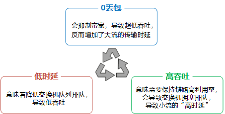 從上一節(jié)來看,為了滿足AI時代的數(shù)據(jù)高效處理訴求、應(yīng)對分布式架構(gòu)挑戰(zhàn),0丟包、低時延、高吞吐成為下一代數(shù)據(jù)中心網(wǎng)絡(luò)的三個核心指標(biāo)。這三個核心指標(biāo)是互相影響,有蹺蹺板效應(yīng),同時達(dá)到最優(yōu)有很大的挑戰(zhàn)。