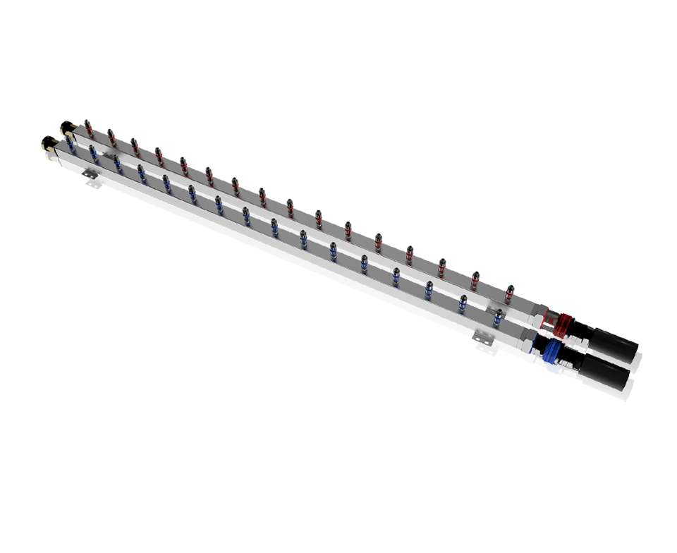 Manifold主要用于機(jī)柜內(nèi)各液冷設(shè)備之間的冷卻介質(zhì)分配,有耐腐蝕、強(qiáng)度高、易拓展等特點(diǎn)。根據(jù)使用需求,有單管和雙排管之分,單管主要用于手插連接,雙排管用于百插連接,雙排管之間為焊接連接,兩管路位置精度+0.15mm,屬于超精密制造。