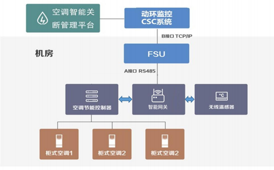 整系統(tǒng)由空調(diào)智能關(guān)斷管理平臺(tái)及部署在機(jī)房側(cè)的空調(diào)節(jié)能控制器、智能網(wǎng)關(guān)、無線溫度傳感器等組成; 平臺(tái)部署在內(nèi)網(wǎng)服務(wù)器,對(duì)接動(dòng)環(huán)監(jiān)控CSC系統(tǒng),通過動(dòng)環(huán)系統(tǒng)進(jìn)行帶內(nèi)傳輸?shù)姆绞脚c節(jié)能設(shè)備進(jìn)行通信,機(jī)房側(cè)的監(jiān)測及控制設(shè)備通過RS485進(jìn)行回傳數(shù)據(jù)至服務(wù)器,實(shí)現(xiàn)平臺(tái)對(duì)空調(diào)控制器等節(jié)能設(shè)備的監(jiān)測和控制,并按策略執(zhí)行空調(diào)節(jié)能控制